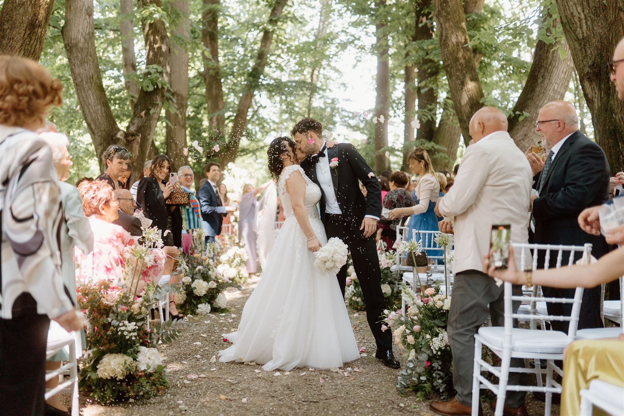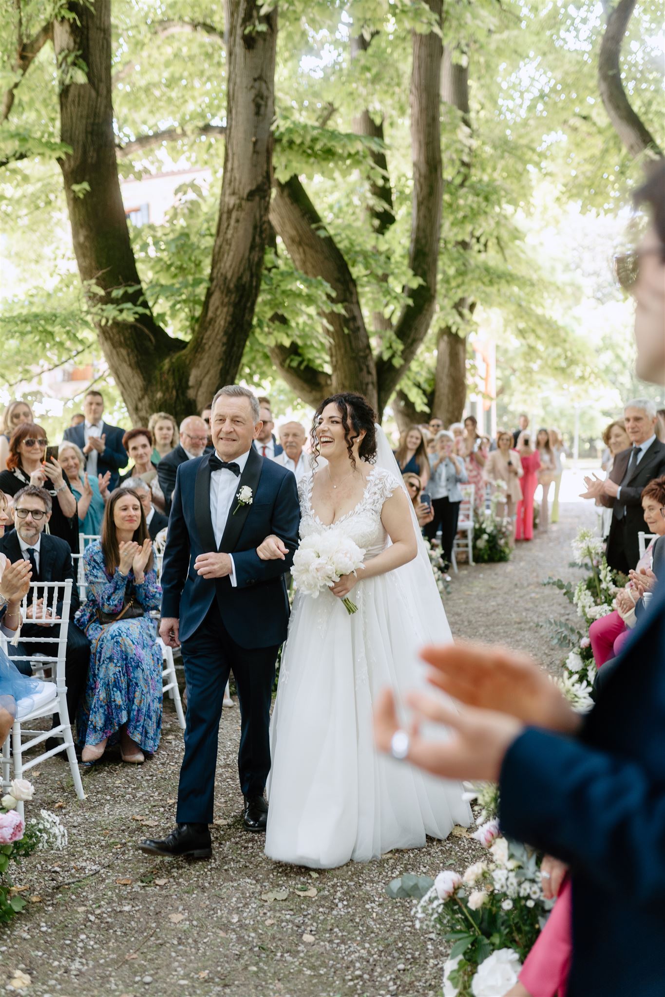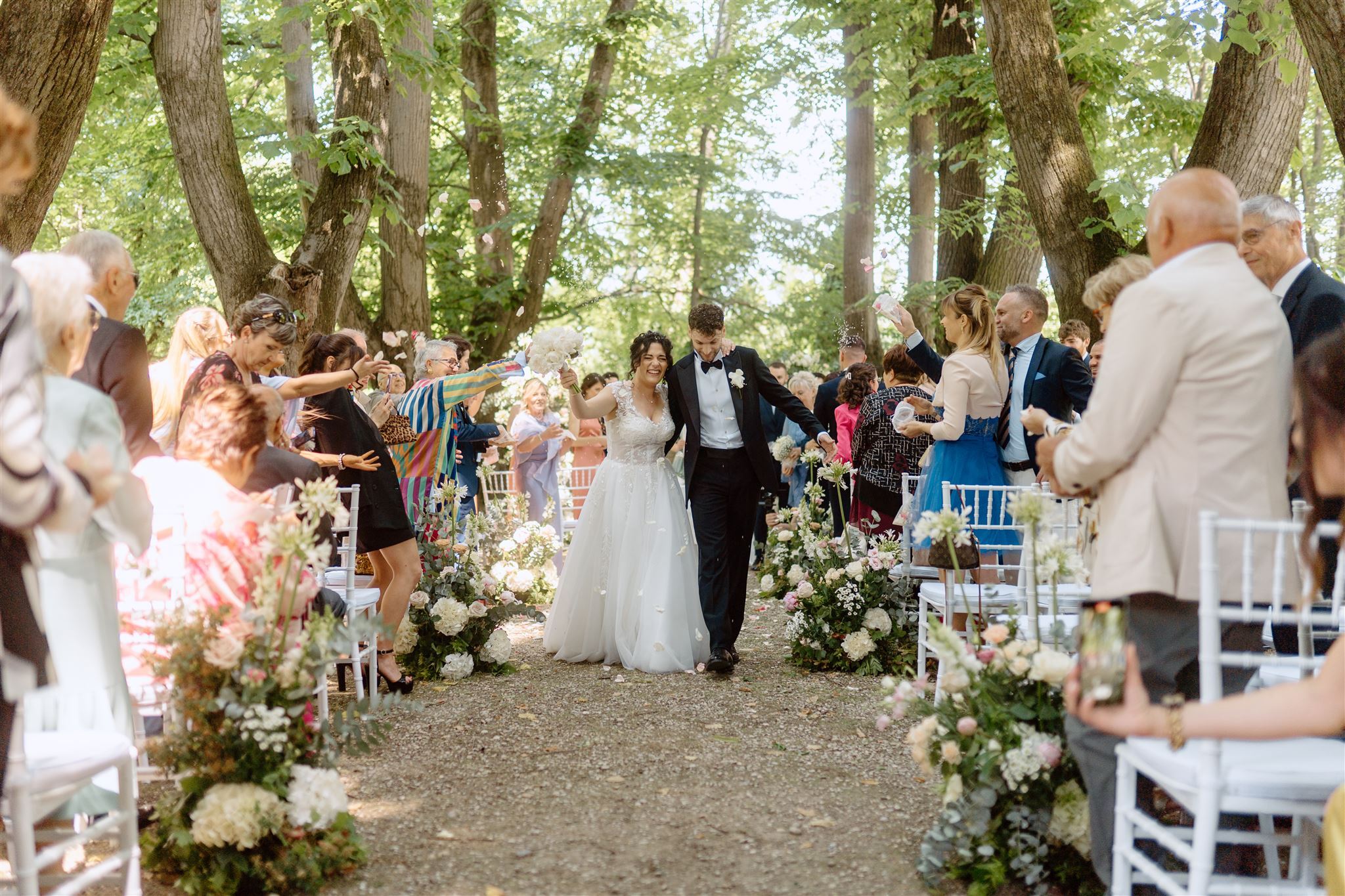La cerimonia si è svolta all'aria aperta, lungo il suggestivo viale dei carpini del parco in un tripudio di fiori dai tenui colori primaverili. Dopo la commovente cerimonia, il ricevimento è proseguito nel giardino della villa per un lungo aperitivo all'aperto seguito da una cena a lume di candela sotto l'ampio porticato affacciato sul parco.