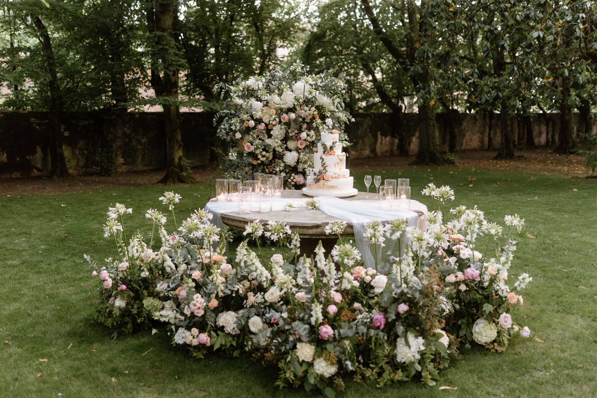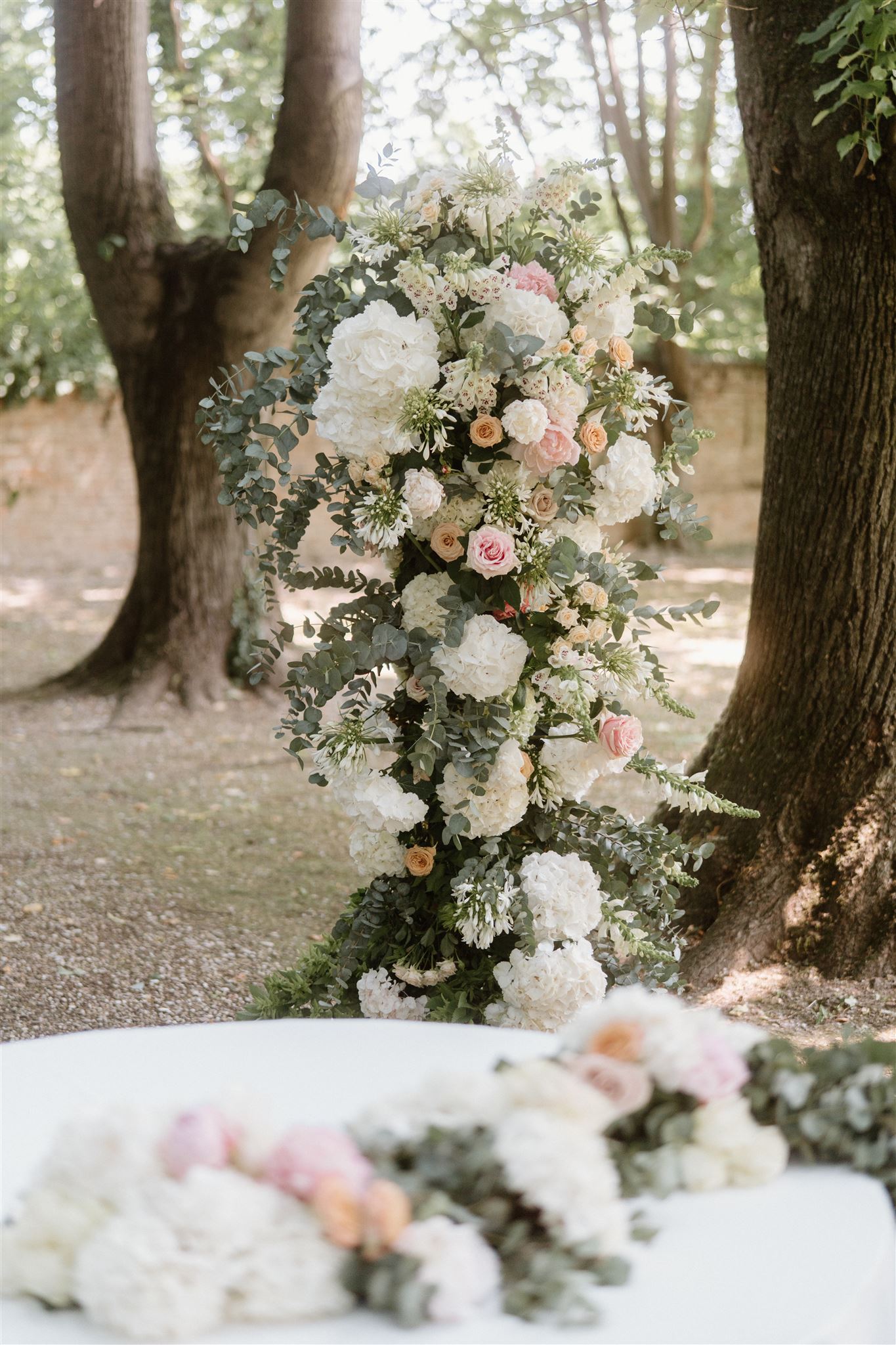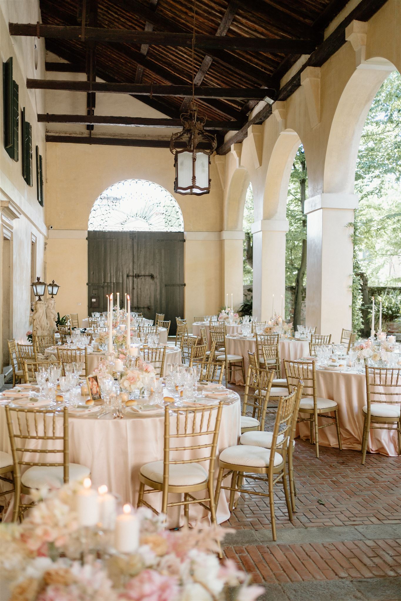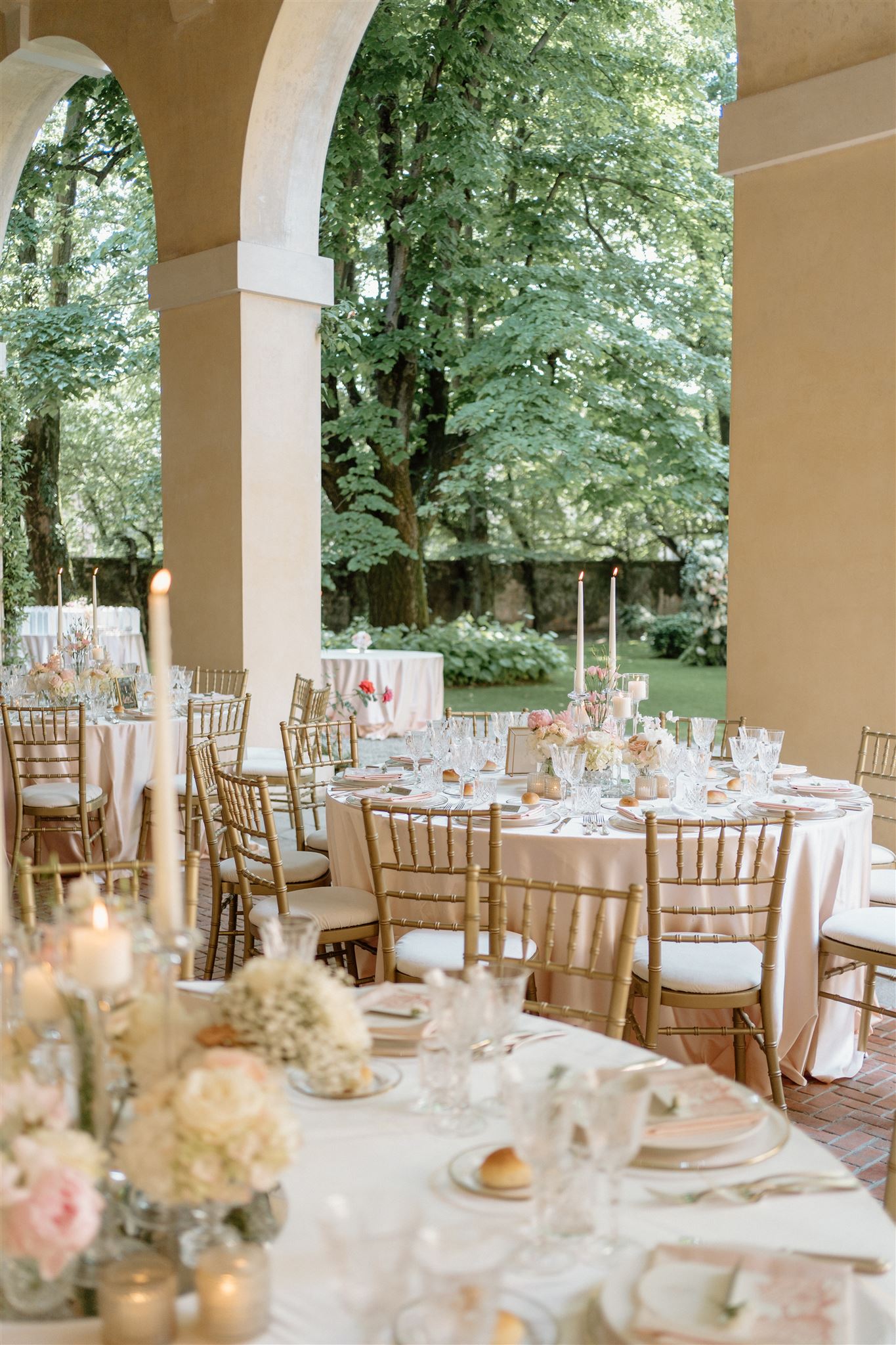 La cerimonia si è svolta all'aria aperta, lungo il suggestivo viale dei carpini del parco in un tripudio di fiori dai tenui colori primaverili. Dopo la commovente cerimonia, il ricevimento è proseguito nel giardino della villa per un lungo aperitivo all'aperto seguito da una cena a lume di candela sotto l'ampio porticato affacciato sul parco.