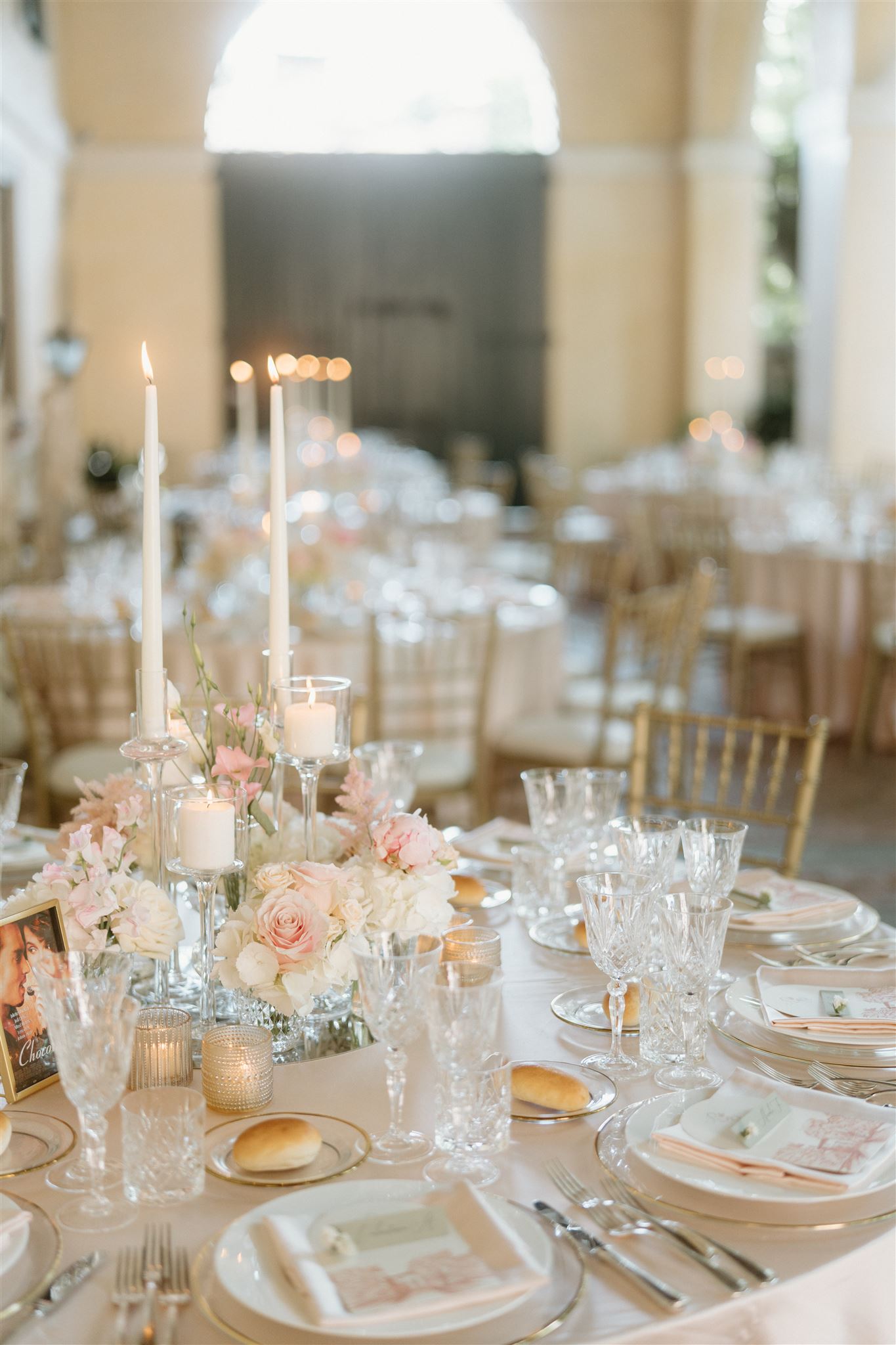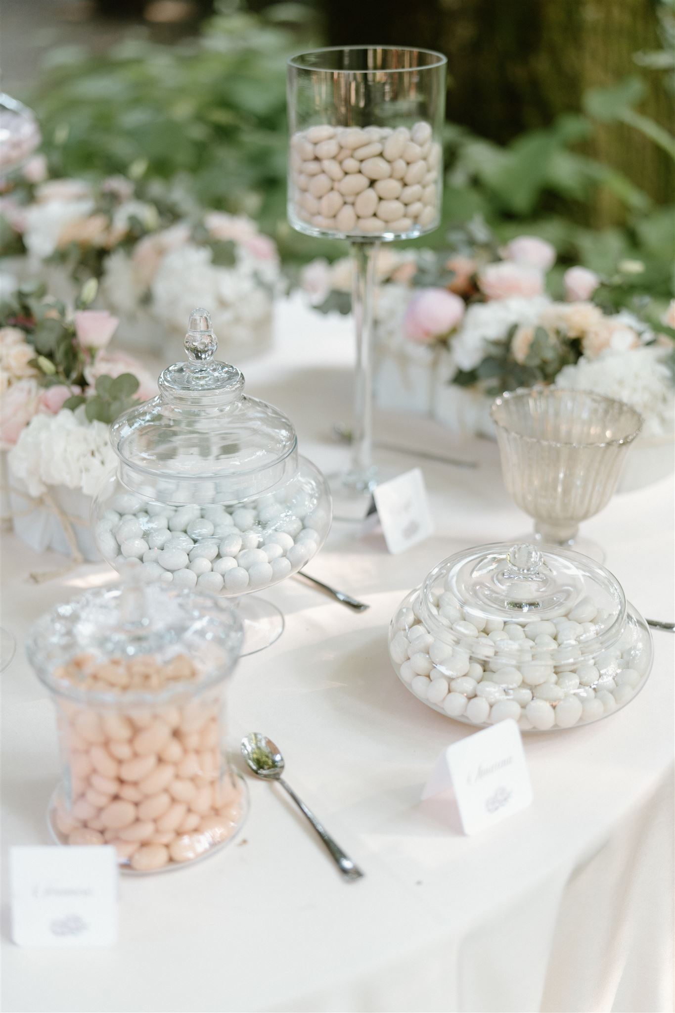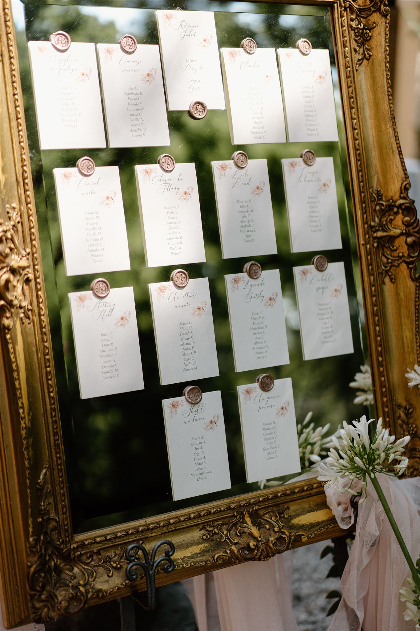 Le tavole riccamente decorate con rose e peonie nei colori tenui del rosa cipria e avorio, avevano il nome dei vecchi film amati dagli sposi, passione, quella del cinema, che ha unito le loro strade.