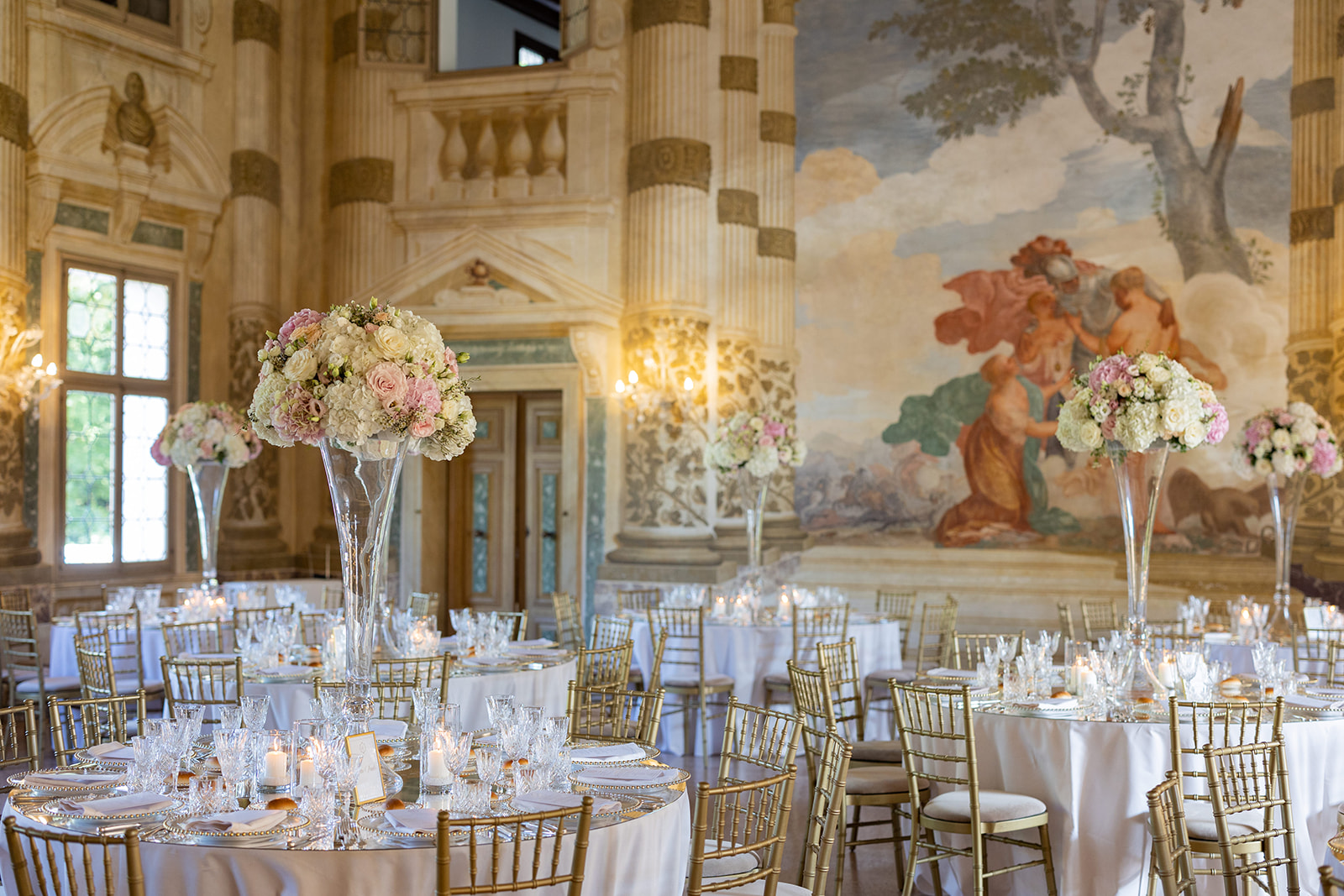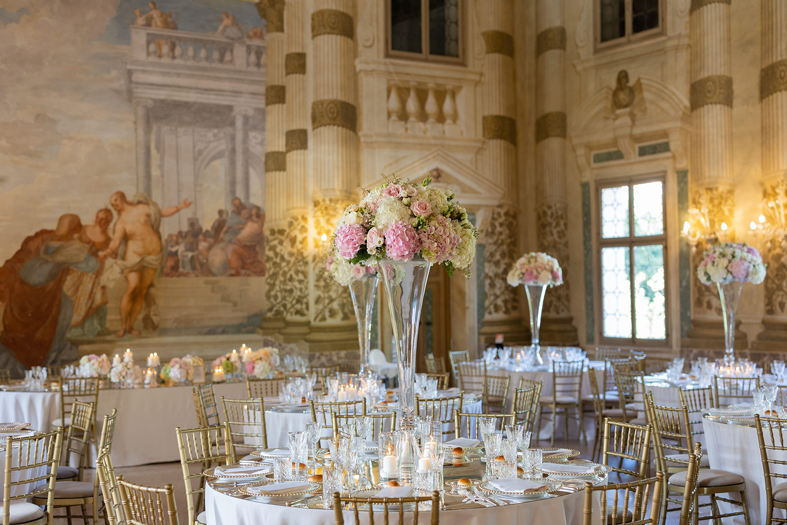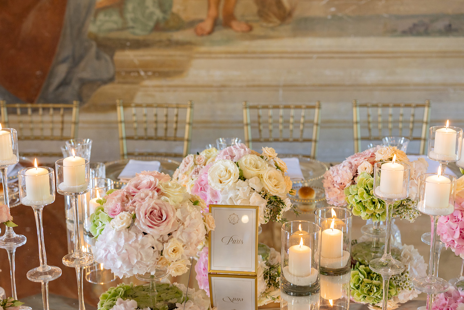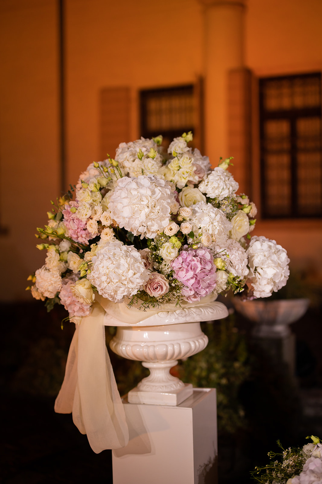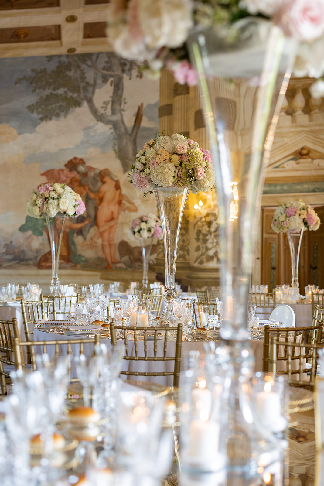 Abbiamo decorato il salone affrescato, dove si è svolta la cena, con composizioni floreali nelle delicate tonalità pastello, caratterizzate da peonie, rose, ortensie e lisianthus. I fiori si armonizzavano perfettamente con la bellezza degli affreschi e la palette cromatica degli interni. Ogni elemento decorativo dei tavoli è stato pensato per esaltare la naturale bellezza del salone, creando un connubio tra raffinatezza e modernità.