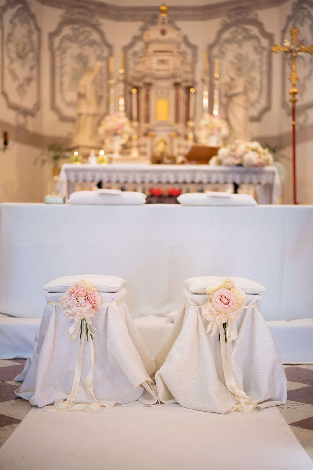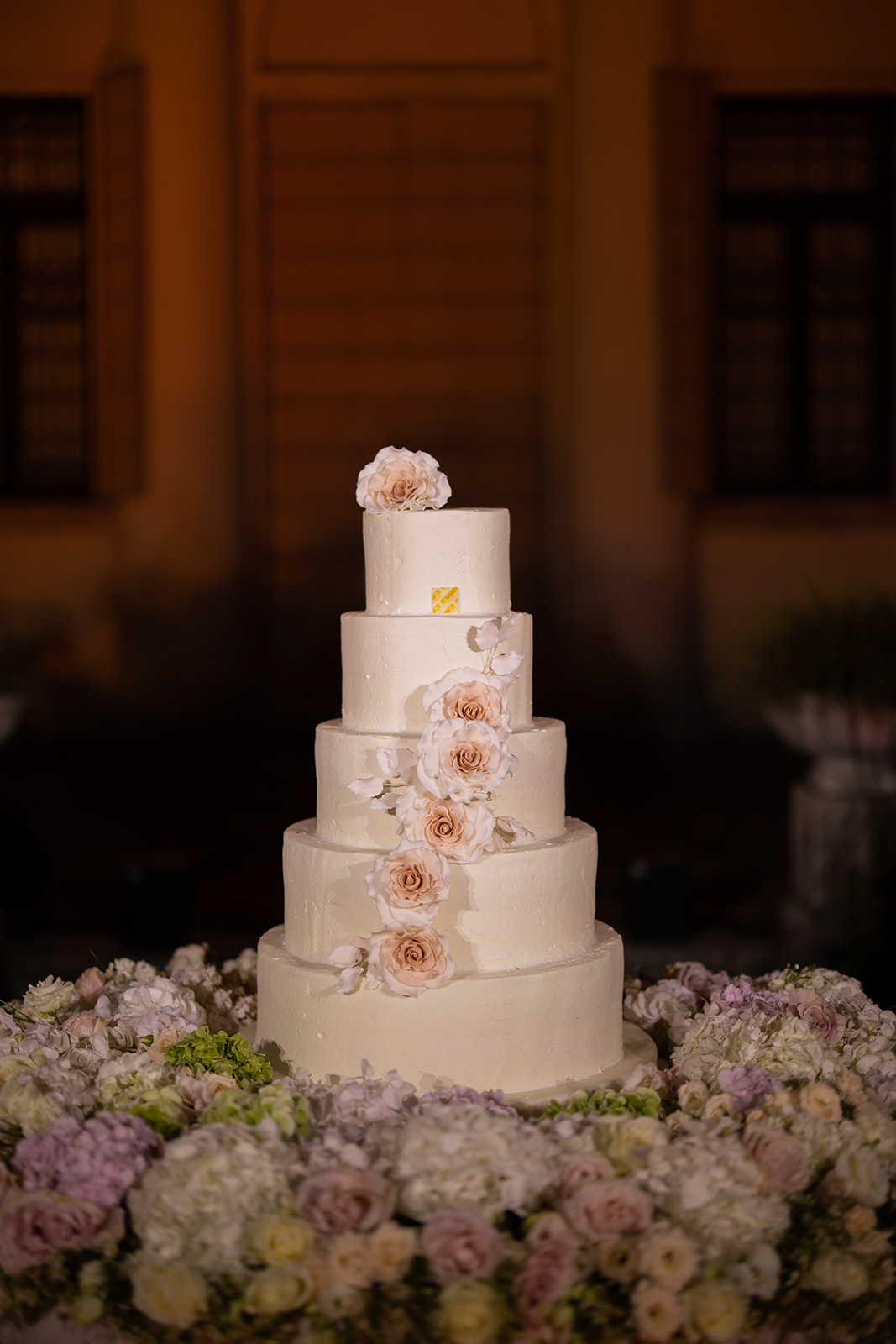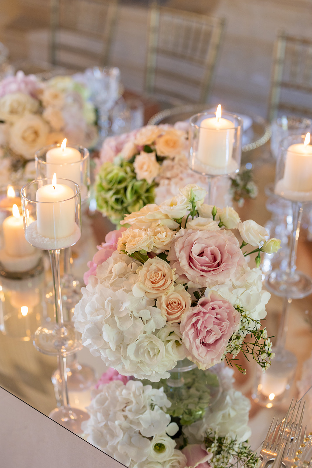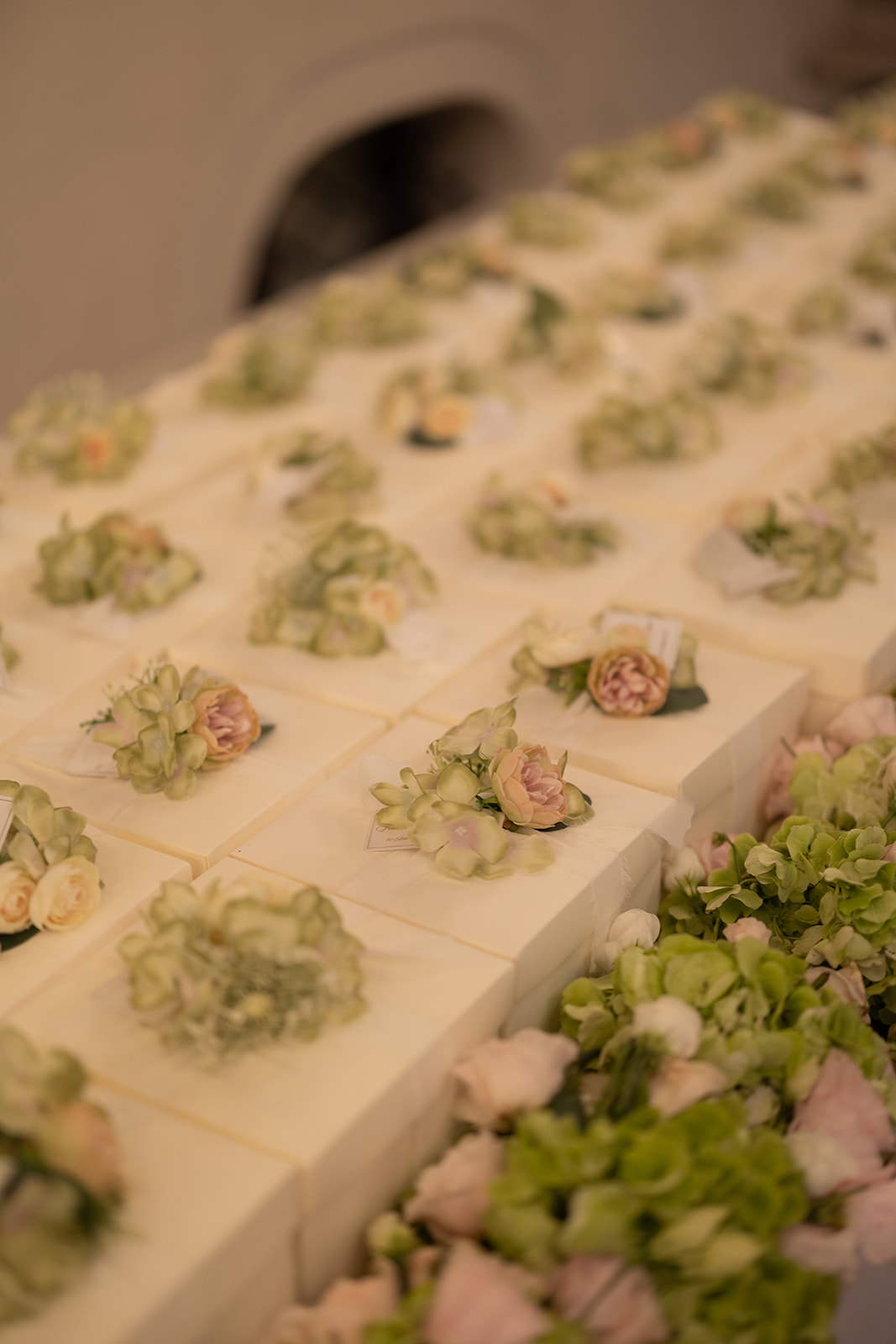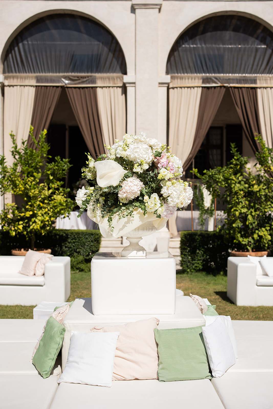 Abbiamo decorato il salone affrescato, dove si è svolta la cena, con composizioni floreali nelle delicate tonalità pastello, caratterizzate da peonie, rose, ortensie e lisianthus. I fiori si armonizzavano perfettamente con la bellezza degli affreschi e la palette cromatica degli interni. Ogni elemento decorativo dei tavoli è stato pensato per esaltare la naturale bellezza del salone, creando un connubio tra raffinatezza e modernità.