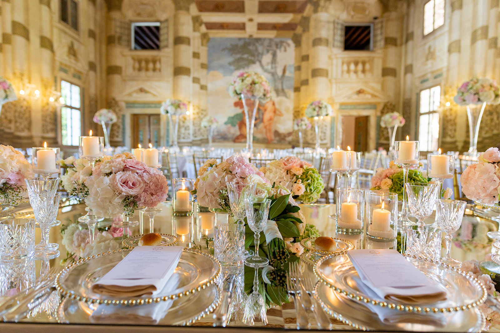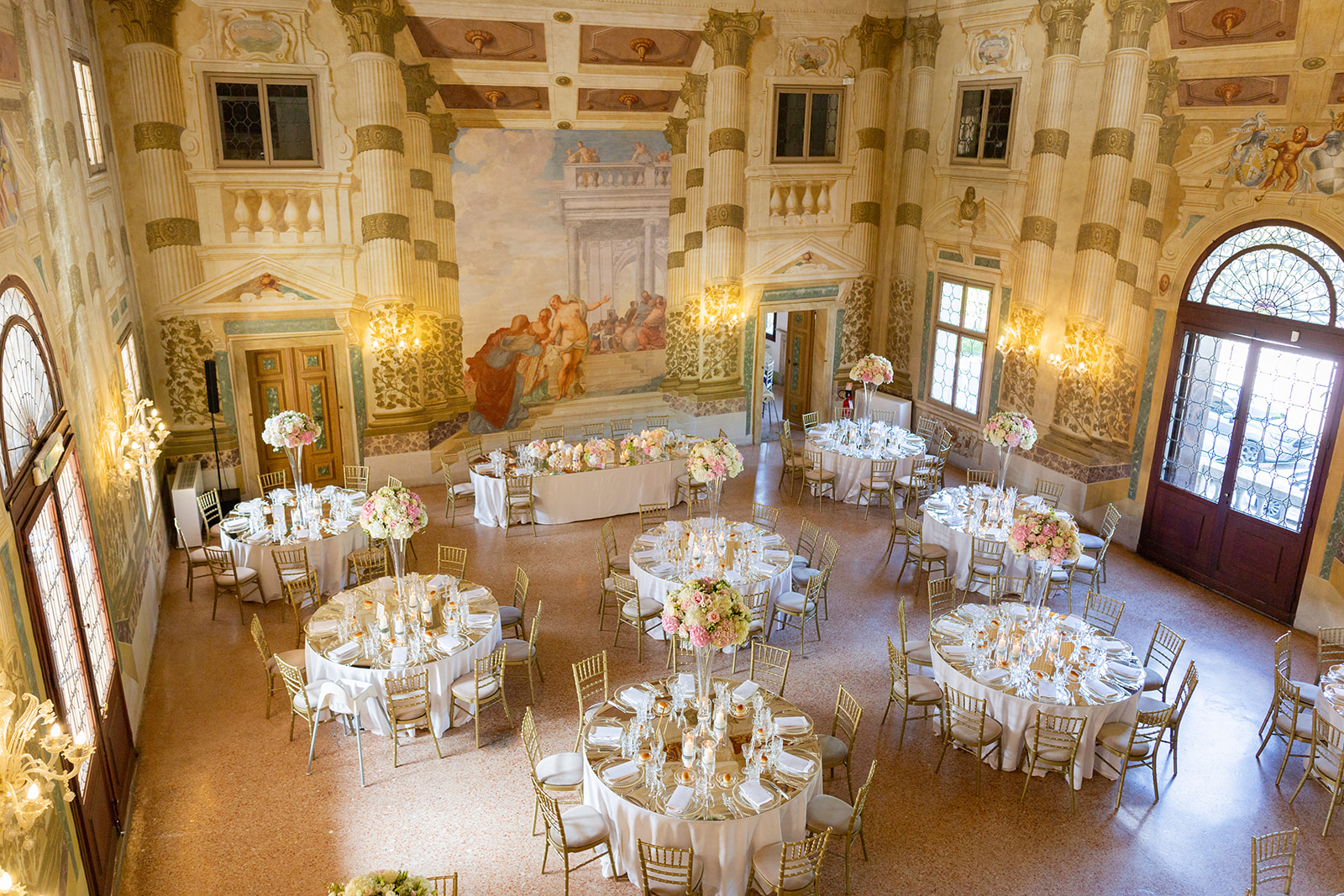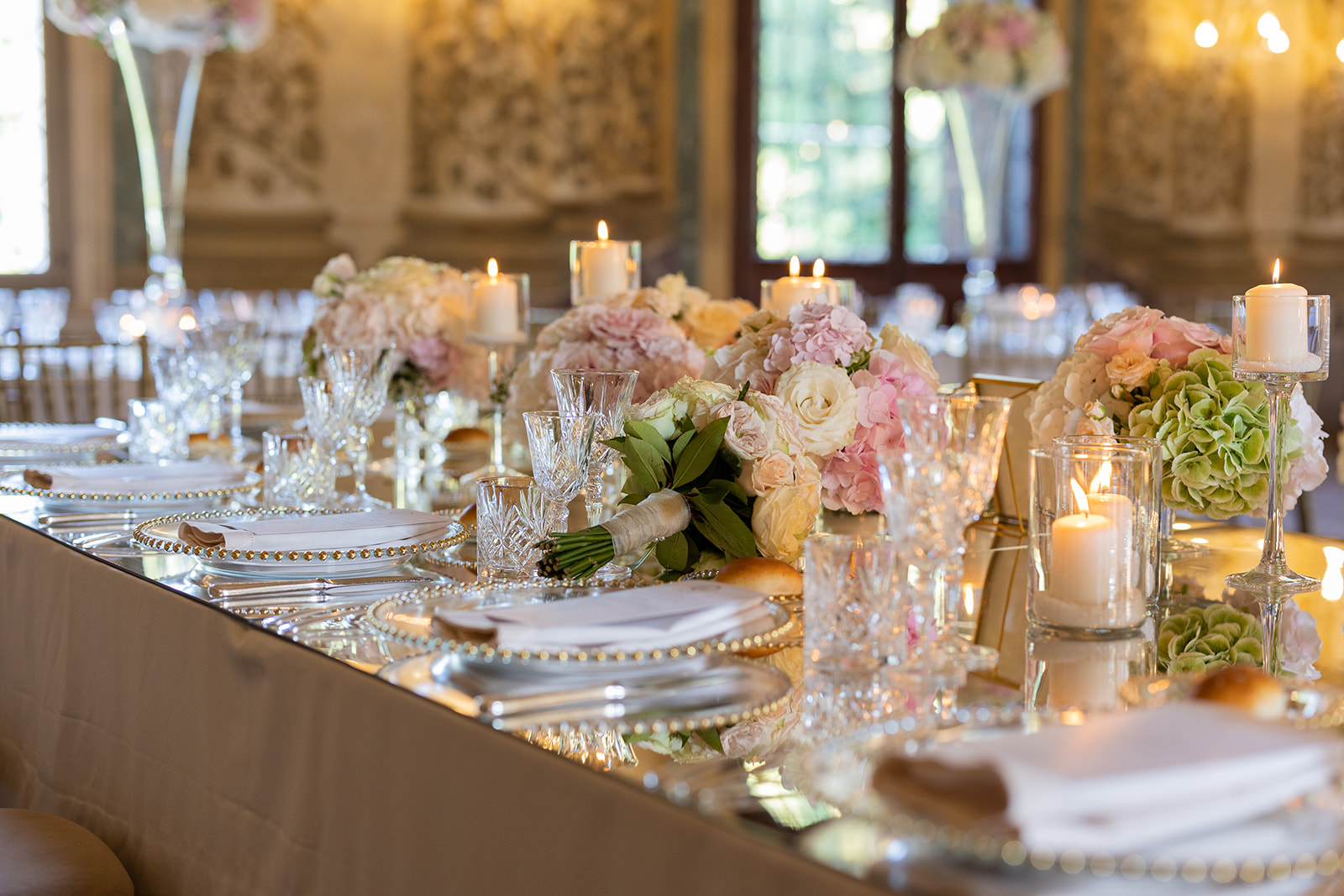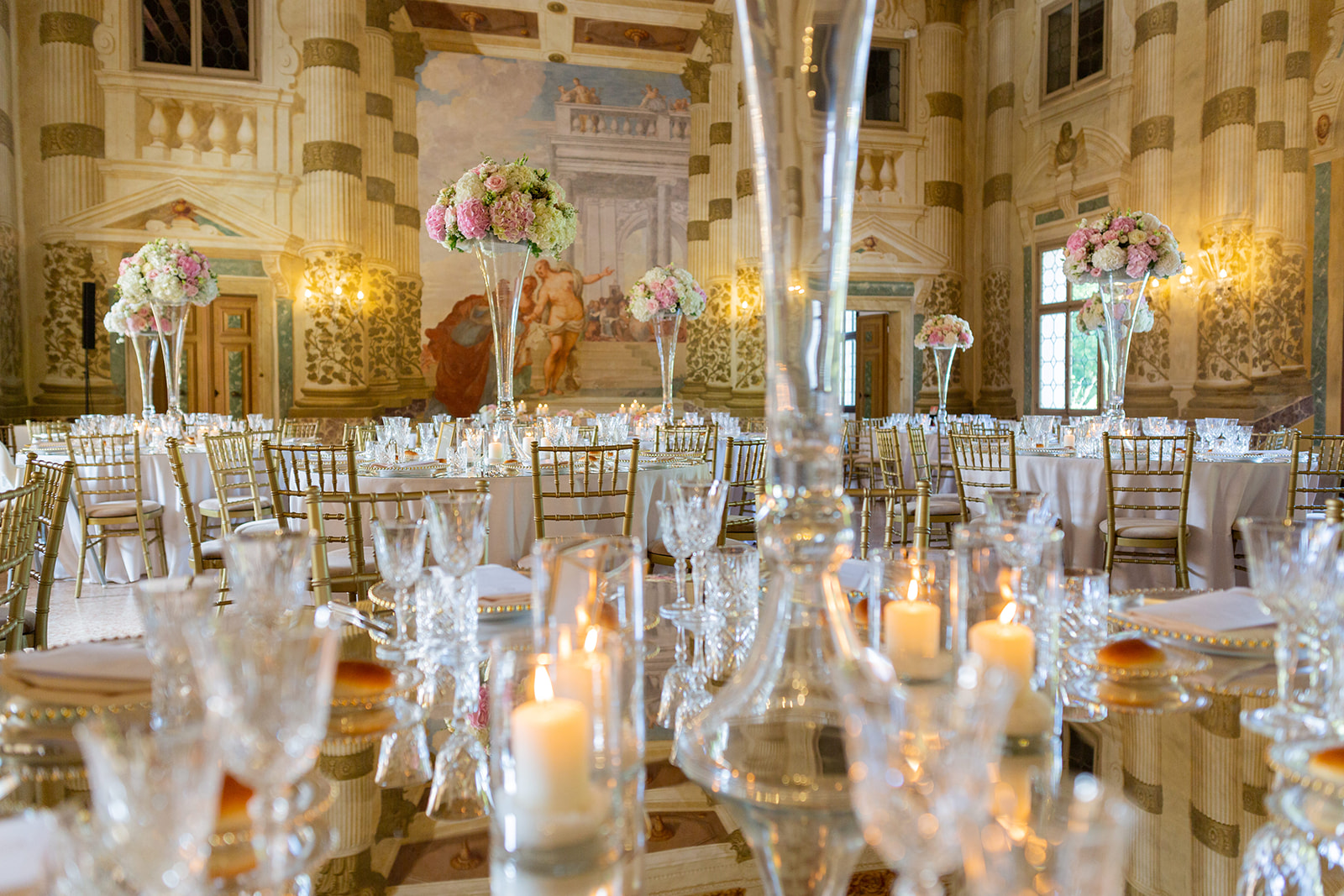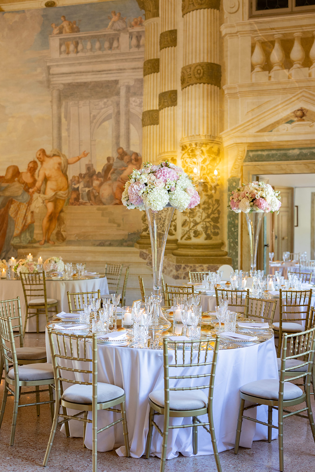 L'aggiunta di elementi ricercati, come cristalli scintillanti e tante candele, ha contribuito a creare un'ambientazione esclusiva e accogliente. Ogni arredo è stato scelto con cura per riflettere lo stile raffinato degli sposi, rendendo questo matrimonio in Villa Foscarini Rossi un vero capolavoro di eleganza.