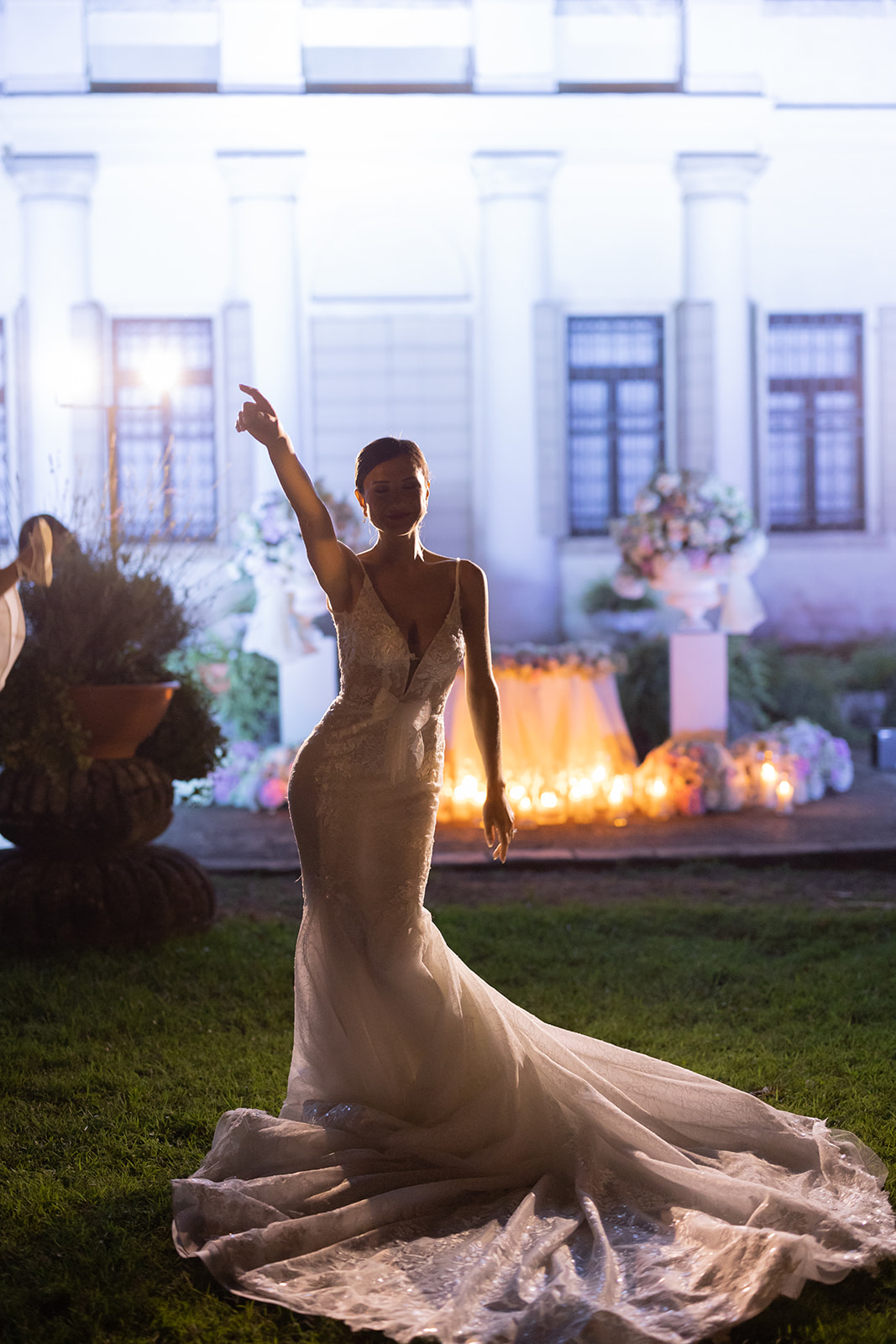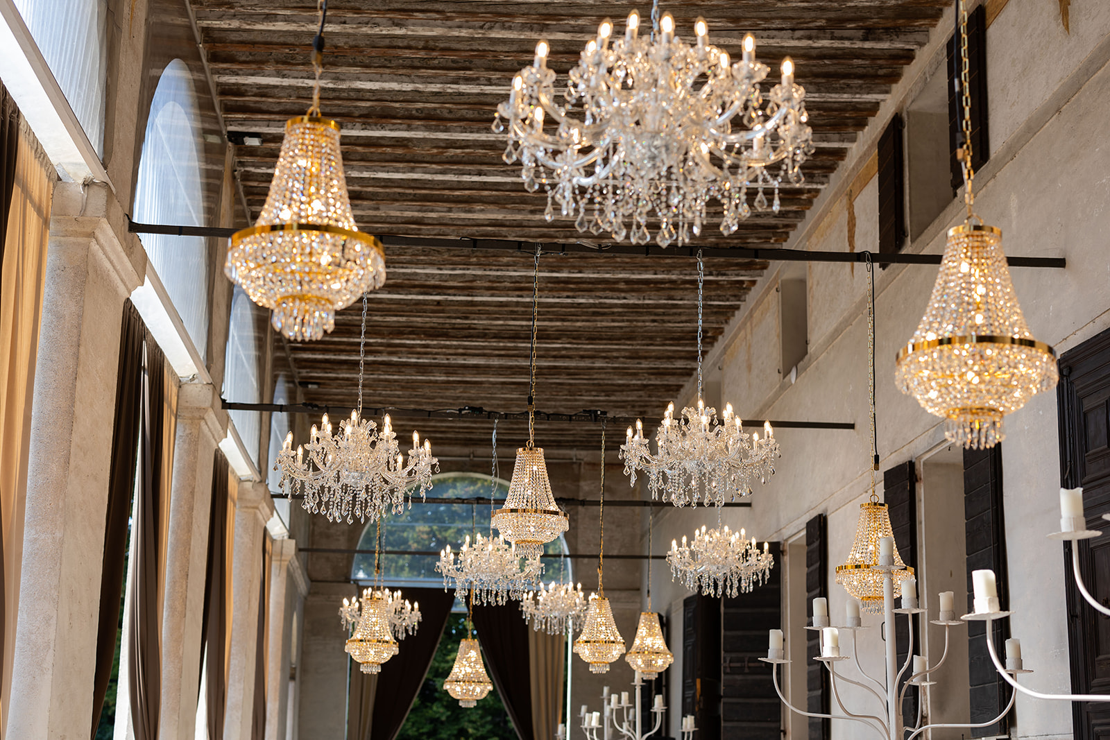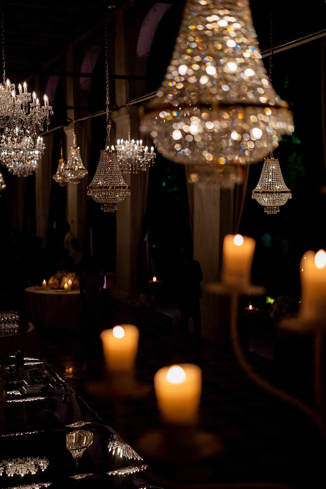 L’allestimento immersivo dei chandeliers di cristallo, che incorniciavano il portico della villa, ha creato un’atmosfera fiabesca e romantica, valorizzando la bellezza architettonica della location. La luce riflessa dalle superfici cristalline aggiungeva un tocco di brillantezza, amplificando il fascino della sera e rendendo ogni momento carico di emozione.