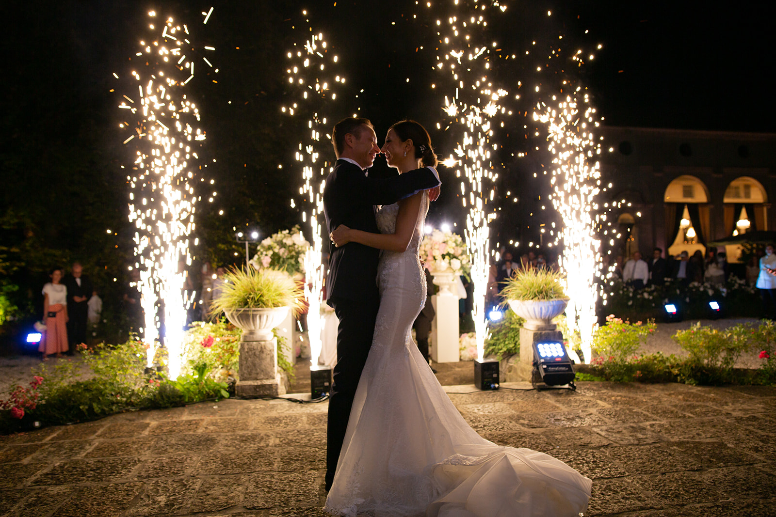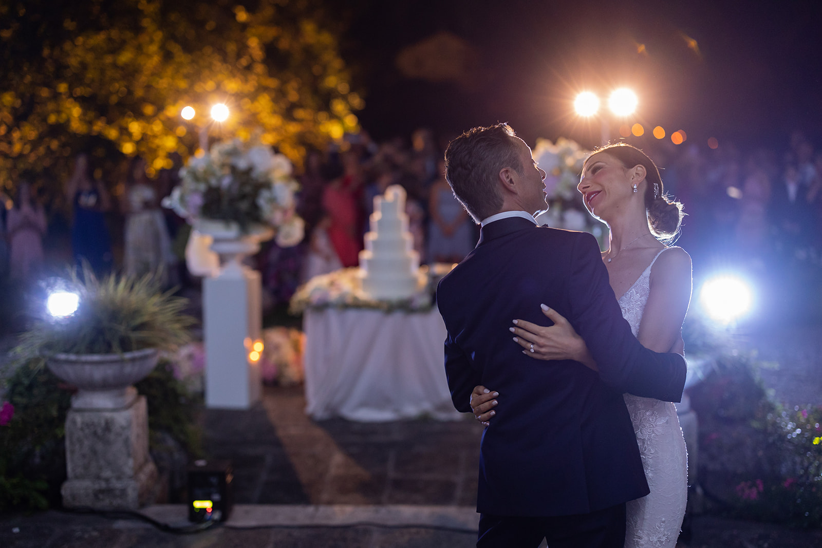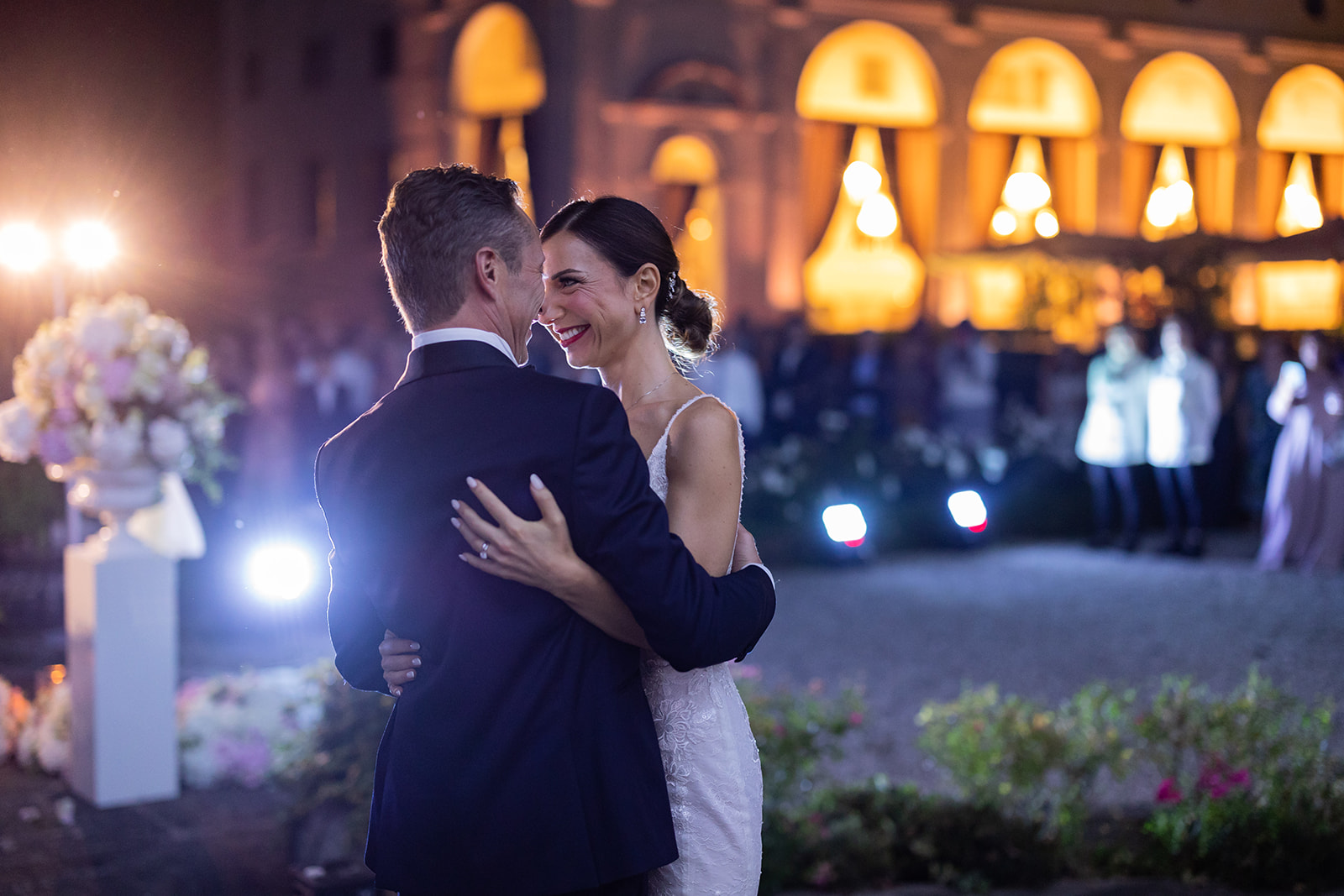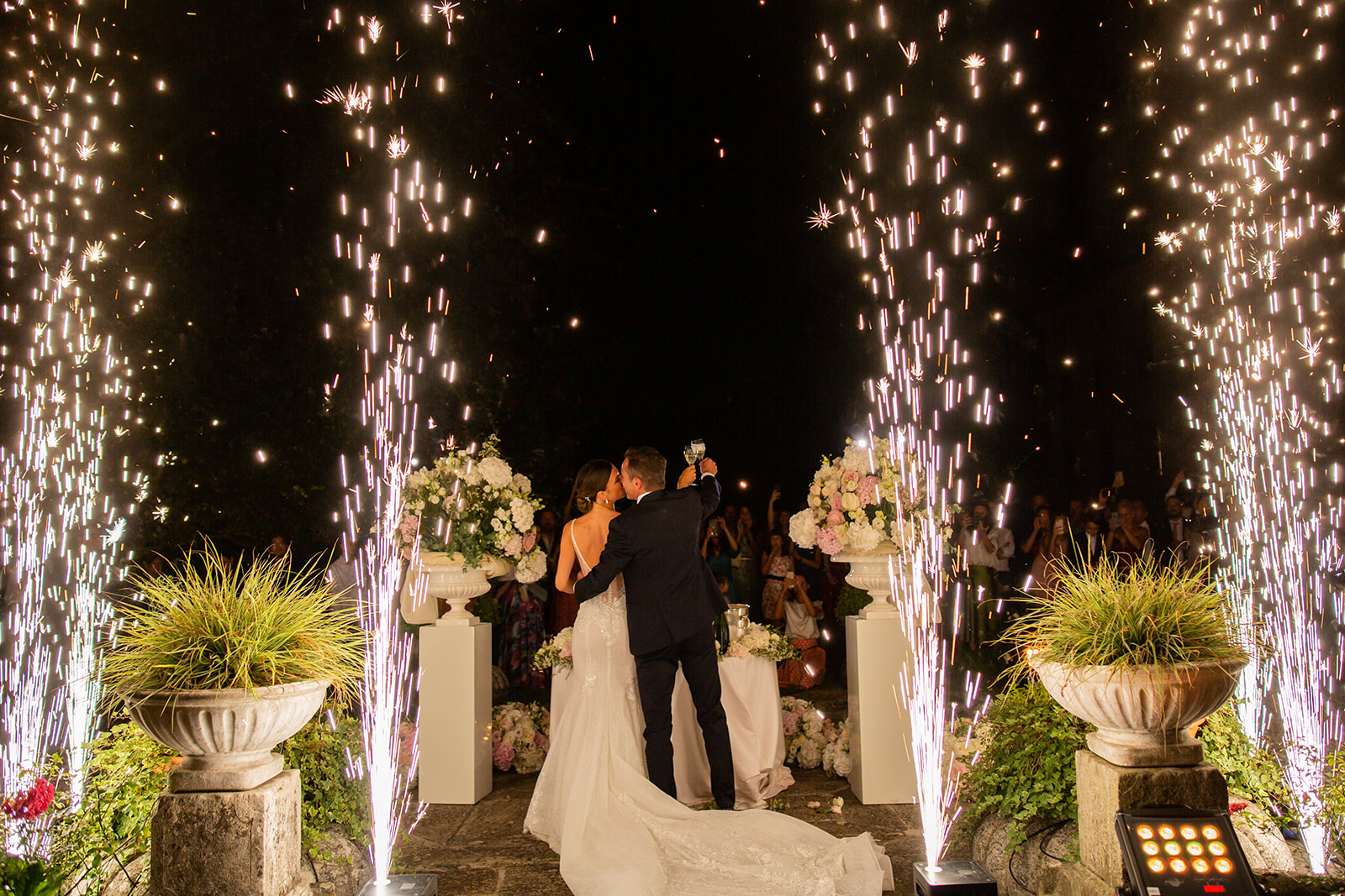 L’allestimento immersivo dei chandeliers di cristallo, che incorniciavano il portico della villa, ha creato un’atmosfera fiabesca e romantica, valorizzando la bellezza architettonica della location. La luce riflessa dalle superfici cristalline aggiungeva un tocco di brillantezza, amplificando il fascino della sera e rendendo ogni momento carico di emozione.