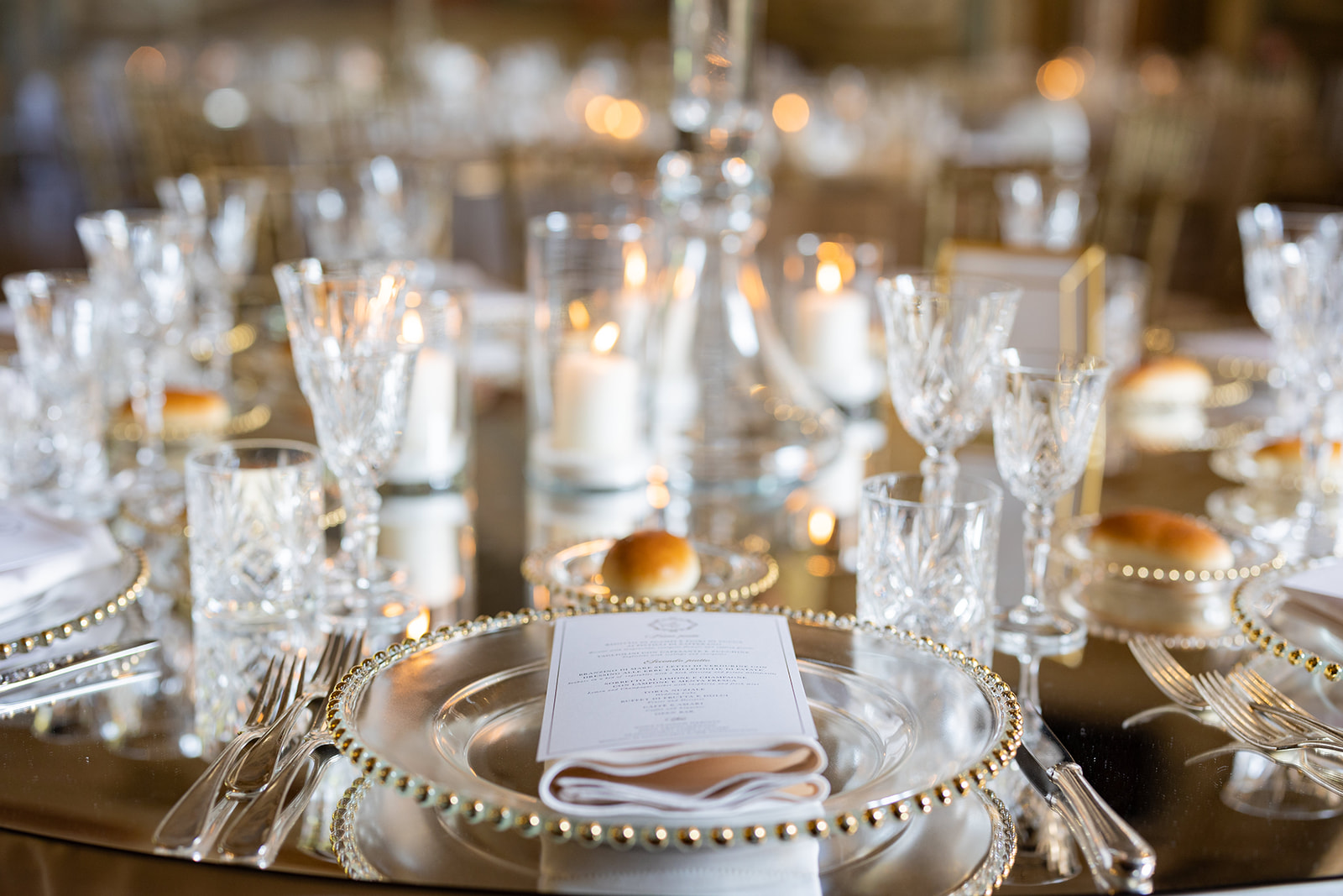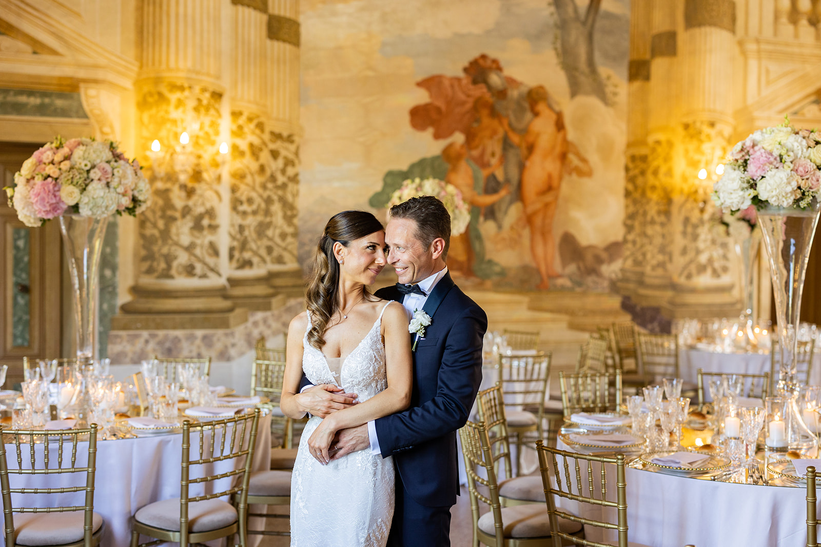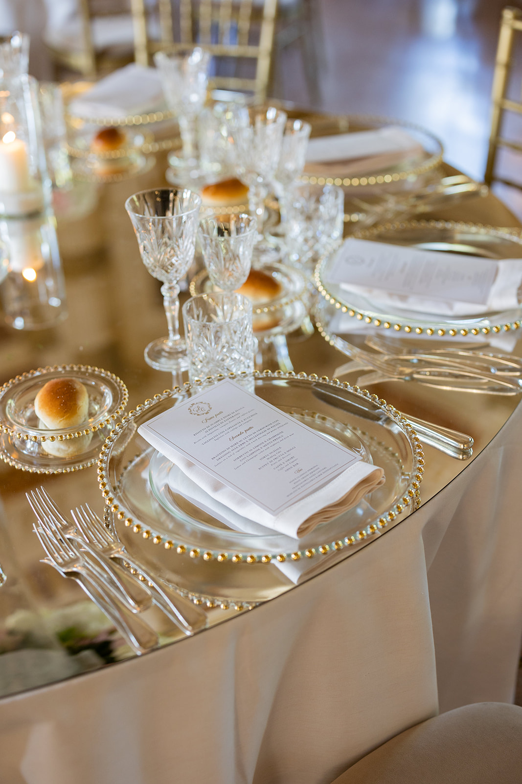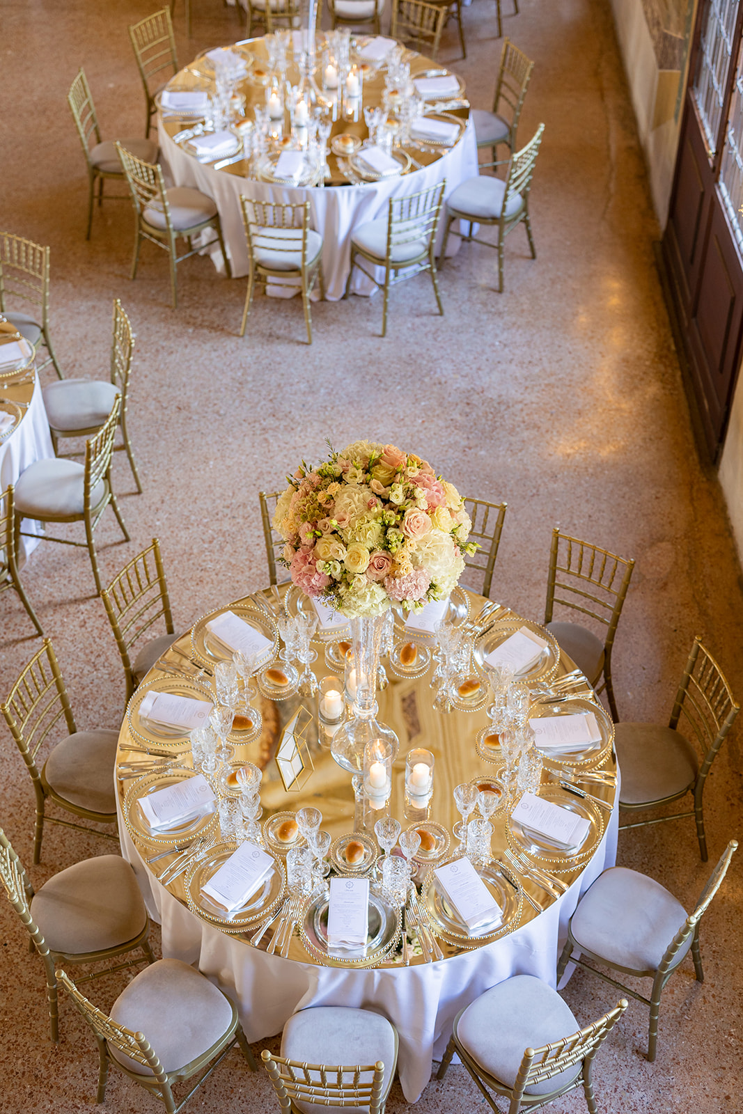 Il ricevimento, allestito con tavoli specchiati, ha regalato un gioco di riflessi straordinario, catturando i dettagli dorati della mise en place e i decori artistici del soffitto. Questo tocco scenografico non solo ha amplificato la sensazione di lusso, ma ha anche donato una dimensione contemporanea a un ambiente intriso di storia.